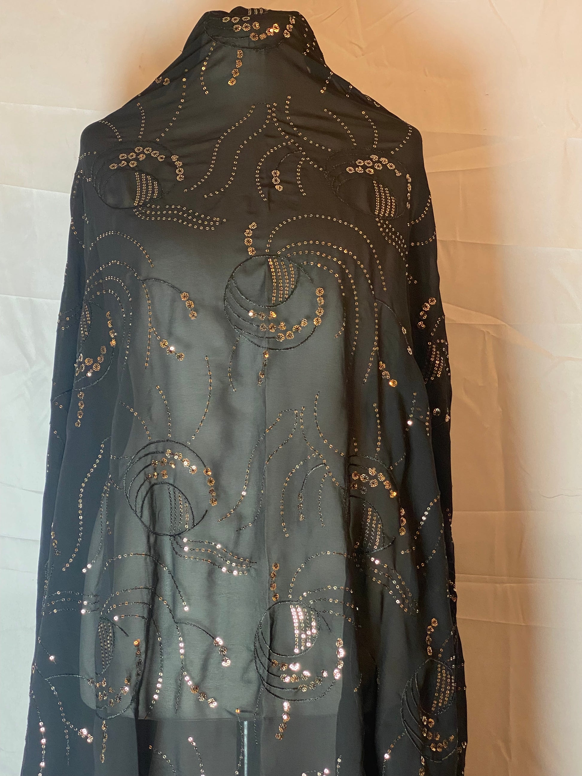 This Unstitched Somali Garbasaar in Black with Gold Embroidery exudes timeless elegance and sophistication. Crafted from lightweight, breathable fabric, it features intricate gold sequin embroidery arranged in artistic flowing patterns.
