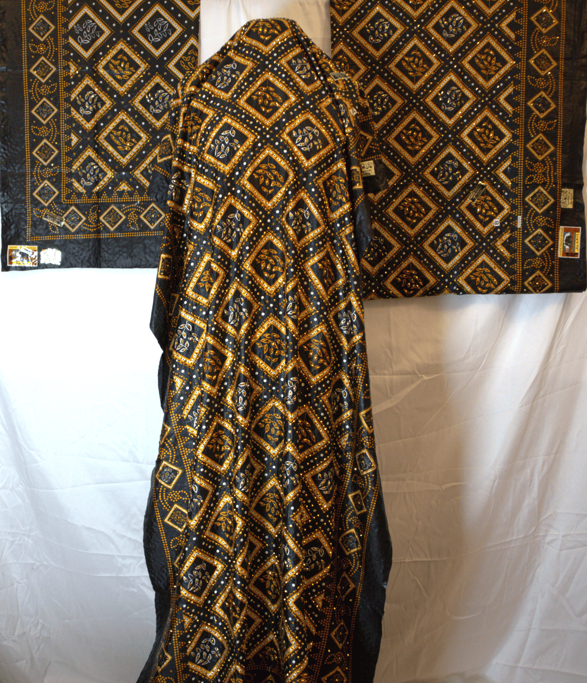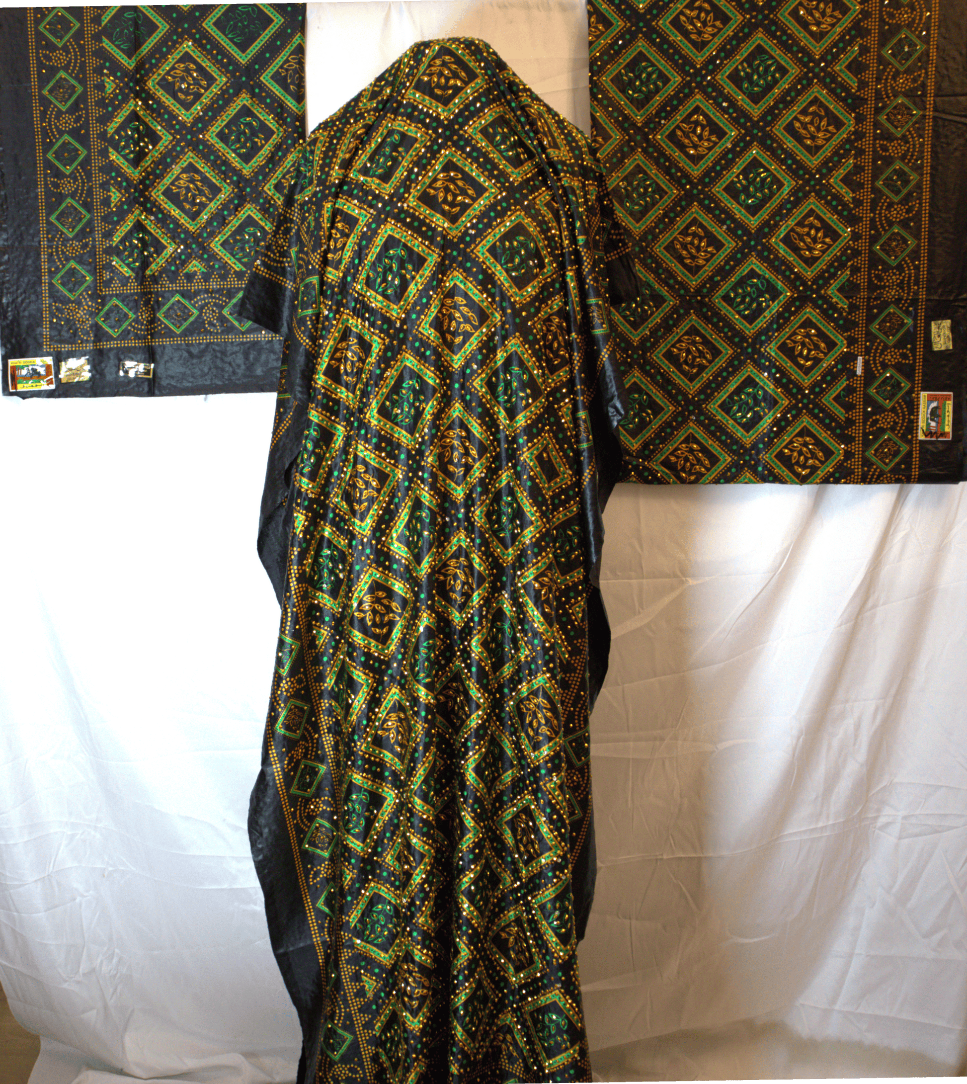 Made from the latest Shaash Dirac material, this fabric shimmers with stones and intricate patterns in rich brown and black. Each set includes: