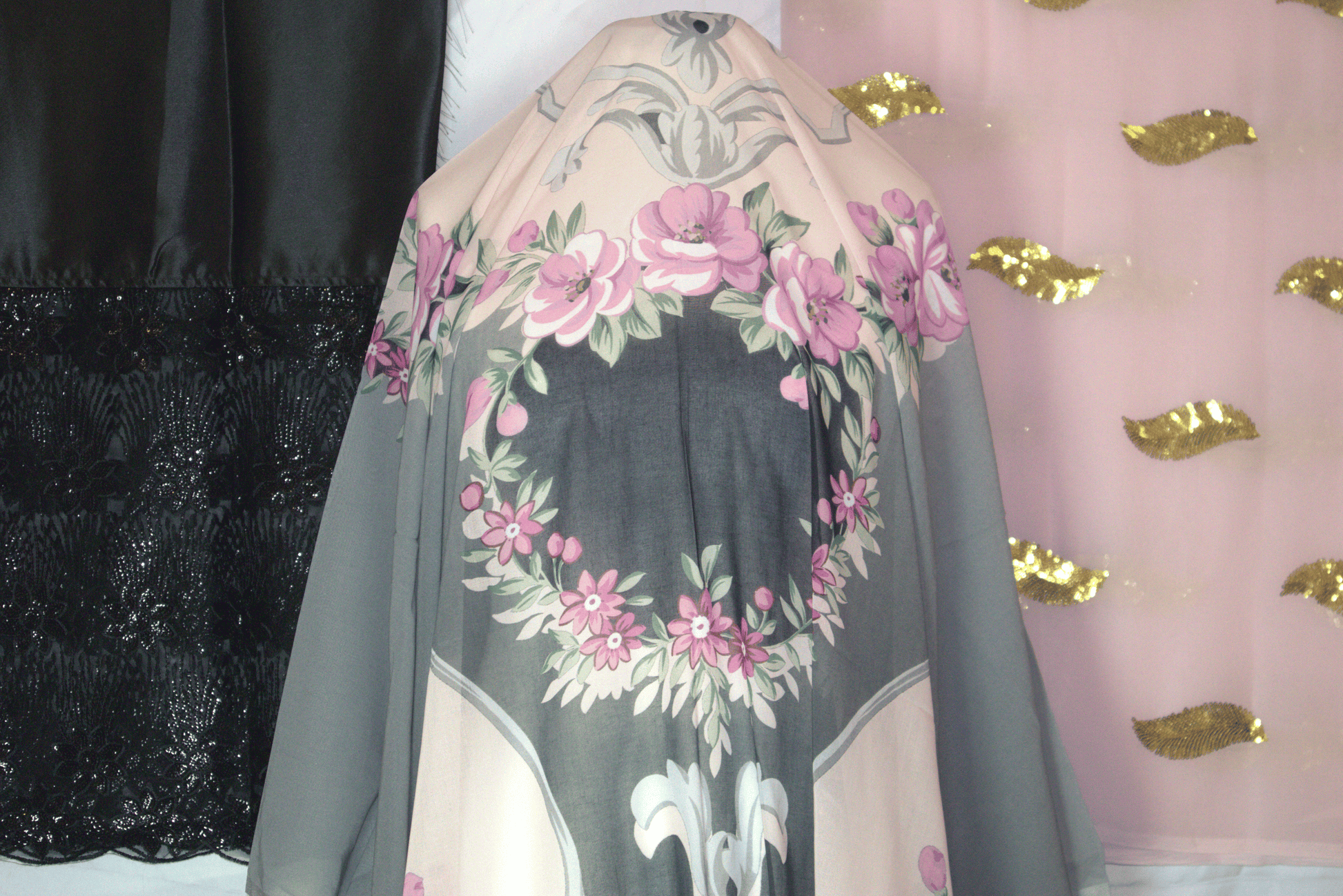 Main Dirac – Black base adorned with soft pink and grey floral prints for a graceful, romantic touch.